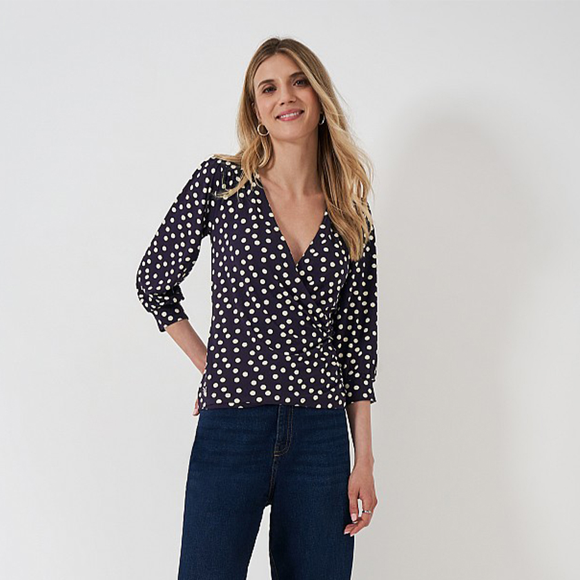 No modern workwear wardrobe is complete without a printed blouse. One that slips easily under casual blazers and pairs well with your favourite skinny jeans. We've designed the perfect one. A jersey wrap top in navy and white polka dot print that feels effortlessly feminine. And we've added cuffed sleeves for extra styling points. We love it worn with our textured collarless jacket, paired with jeans – black jeans and quilted pumps. As for a bag option, a leather black rucksack will complete the look.