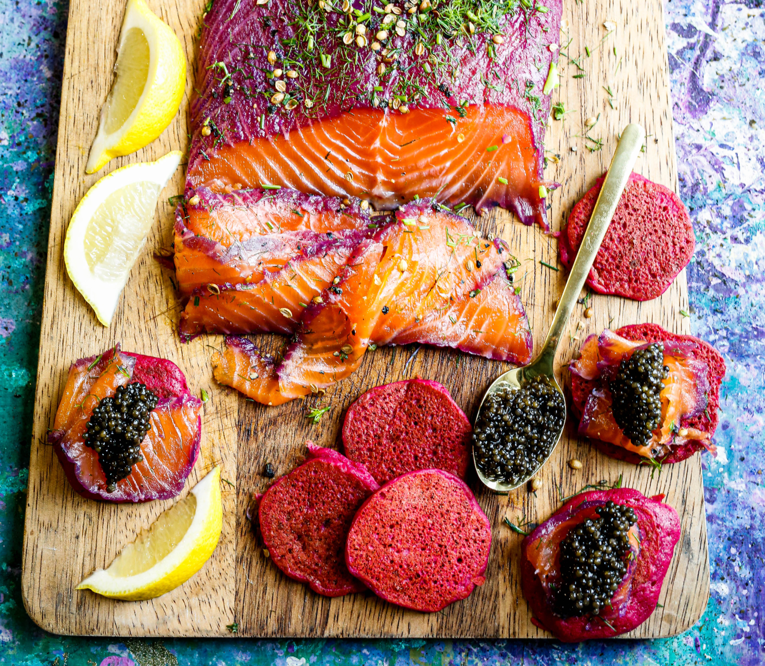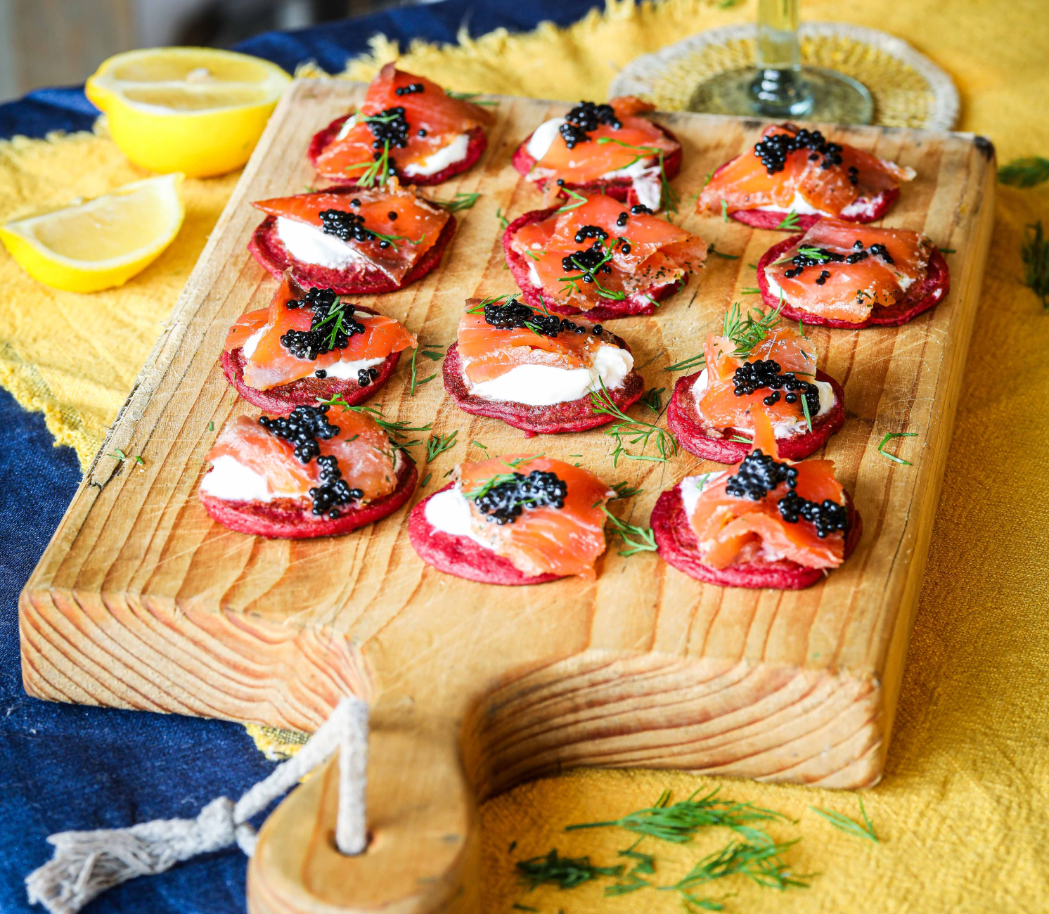 Serve the beetroot blinis with a small dollop of crème fraiche, a slice of beautiful cured salmon and a little caviar on top. Drizzle with a few drops of lemon juice and finish with a small piece of chopped dill