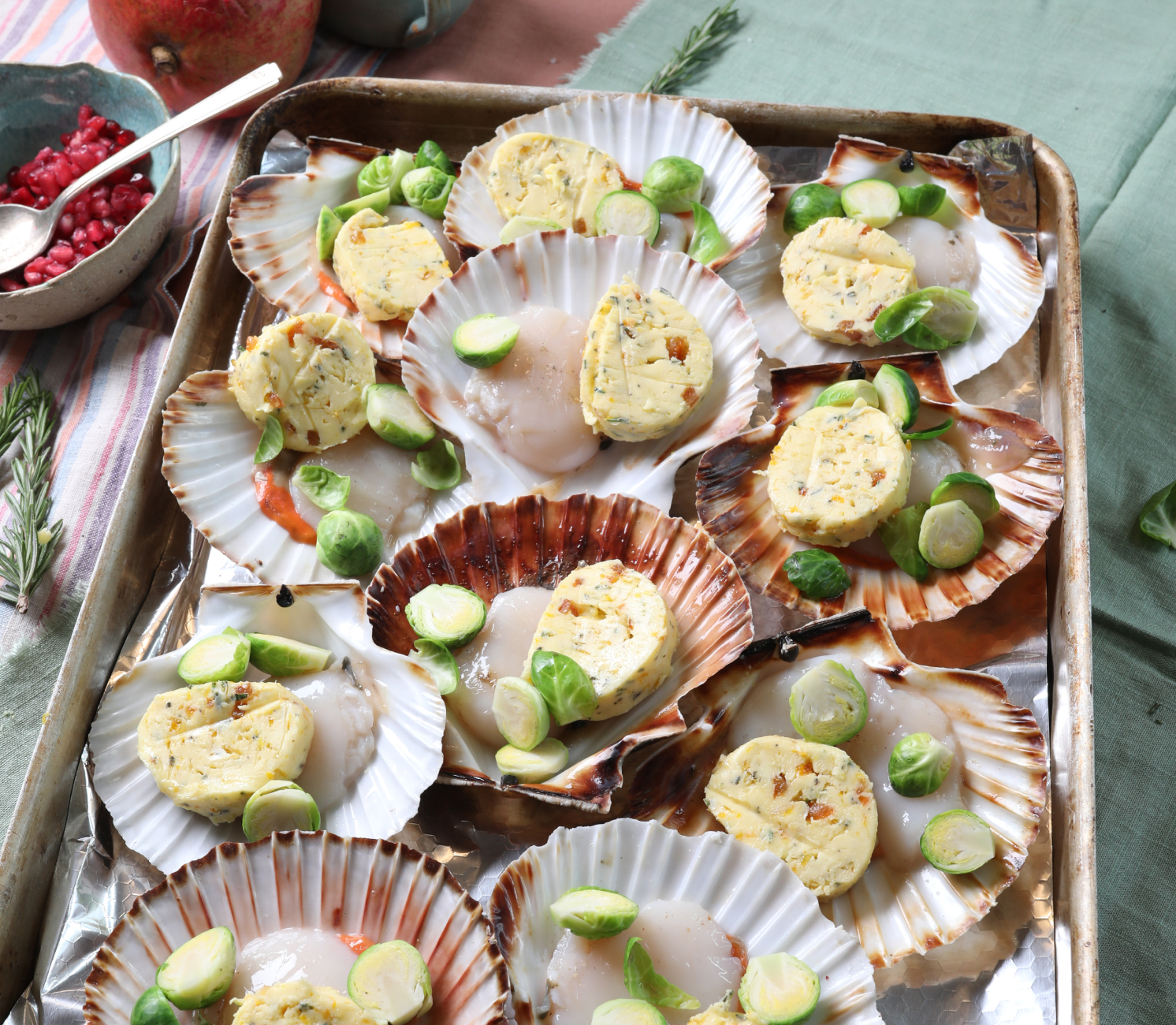 Make your flavoured butter in advance by mixing the butter with your festive herbs, spices and marmalade. Then roll it out into a cylinder on a sheet of baking parchment, wrap and chill in the fridge for 1 hour. Cut neatly into discs and place a large portion on top of each scallop.