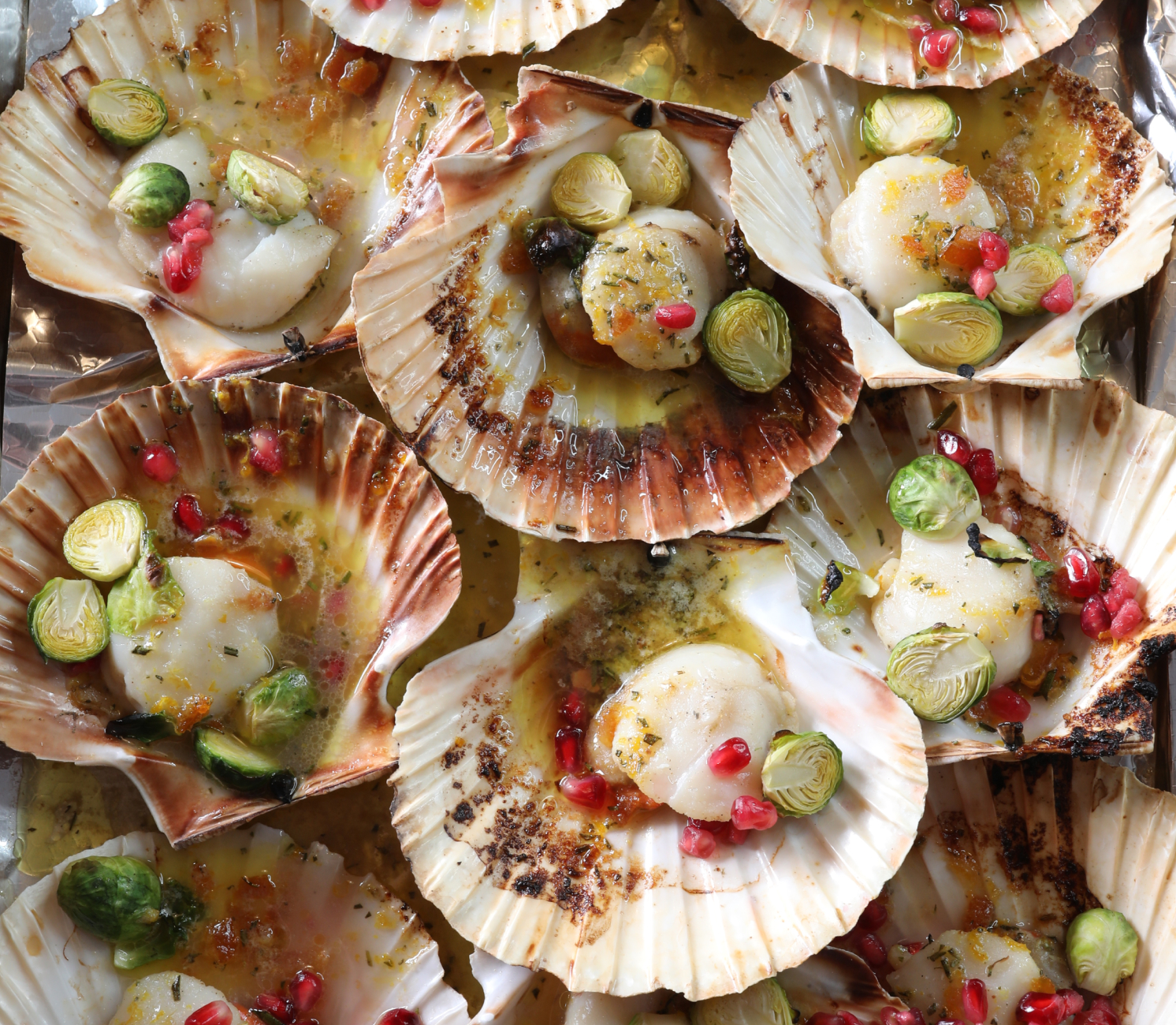 scallop shells and flambé at the table. Garnish with pomegranate seeds and