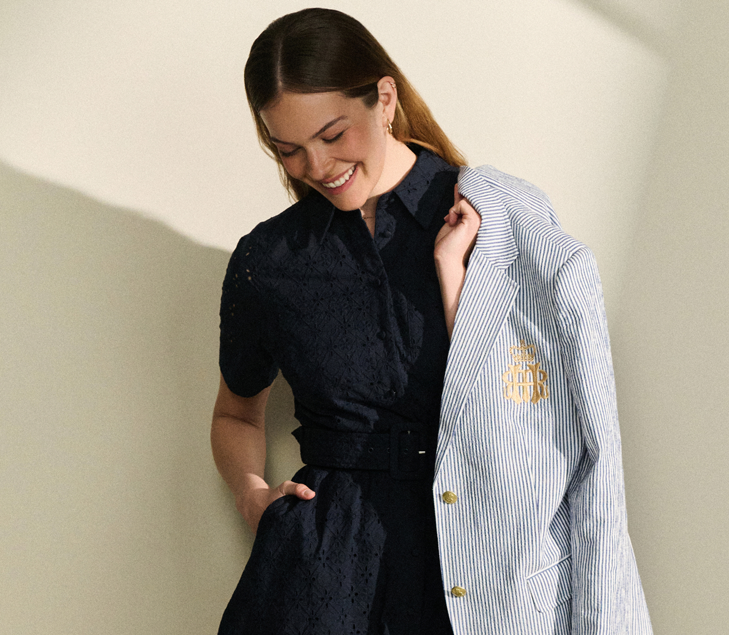 For our men’s collection, inspiration was taken from the heritage, exclusivity and summer ritual of Henley Royal Regatta, where performance meets refined spectator style. Pieces are preppy yet wearable, with fan-favourite half zips, hoodies and polos being adorned with insignia and shield motifs – as well as the Henley Royal Regatta crest and Crew signature crossed oars embroidery. The range is a perfect blend of tradition and modernity, with classic rowing influences reimagined for effortless summer dressing. Our sharp tailoring is also back, with statement stripes and gold-hardware offering a sophisticated, Members-only aesthetic that is perfect for wearing to endless formal events.
