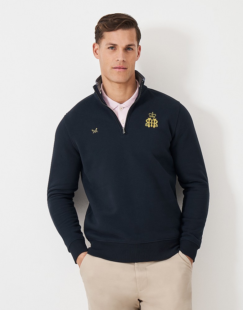 A cotton-mix half-zip sweatshirt from our Henley Royal Regatta collection, in navy blue. Comfortable, and easy to dress up or down, we think it's the perfect spring layer. The crossed oars and crest embroidery add heritage flair, too. It pairs exceptionally well with jeans and chinos alike.