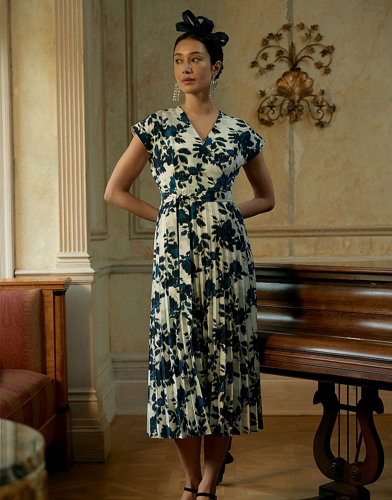 Henley Wrap Front Print Pleated Dress in White Floral