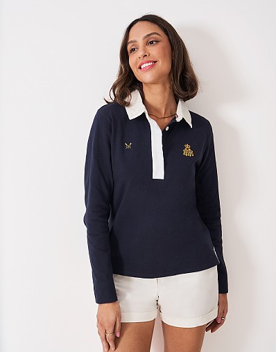A rugby shirt in navy. Combining Henley Royal Regatta branding with all the details you’d expect from Crew, it's a style taken straight from the archives. Wear with the collar up to show off the zig-zag stitching and Henley crest underneath.