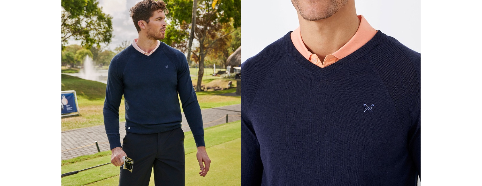 Sleek, functional and inspired by a Crew signature, our engineered sport v neck jumper is already a firm favourite from the collection. Sporting active stretch, this style adapts to the movement of your body for ultimate comfort – so all you need to worry about is perfecting your swing. And it wouldn’t be golf without the signature polo. Take our Smart Golf Polo, in a series of different colourways, it’s been added with extra touches especially for the fairway, including being cut from a copper nylon mix, just the thing to prevent any unwanted odours. The moisture-wicking technology also has quick-drying and cooling properties, so you can tee off with complete ease.