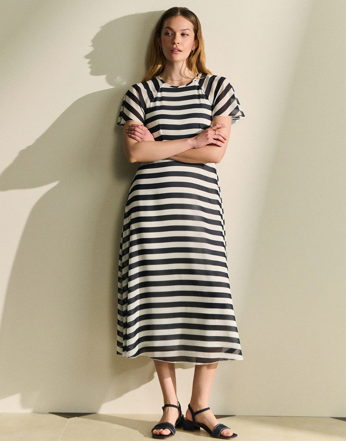 Spark conversation (and compliments) in our Henley Royal Regatta Stripe Midi Dress. In a timeless silhouette that’s endlessly wearable, we’ve taken nautical stripes to new heights with block heels that come with comfiness in tow. Throw on a blazer for all-out sophistication.