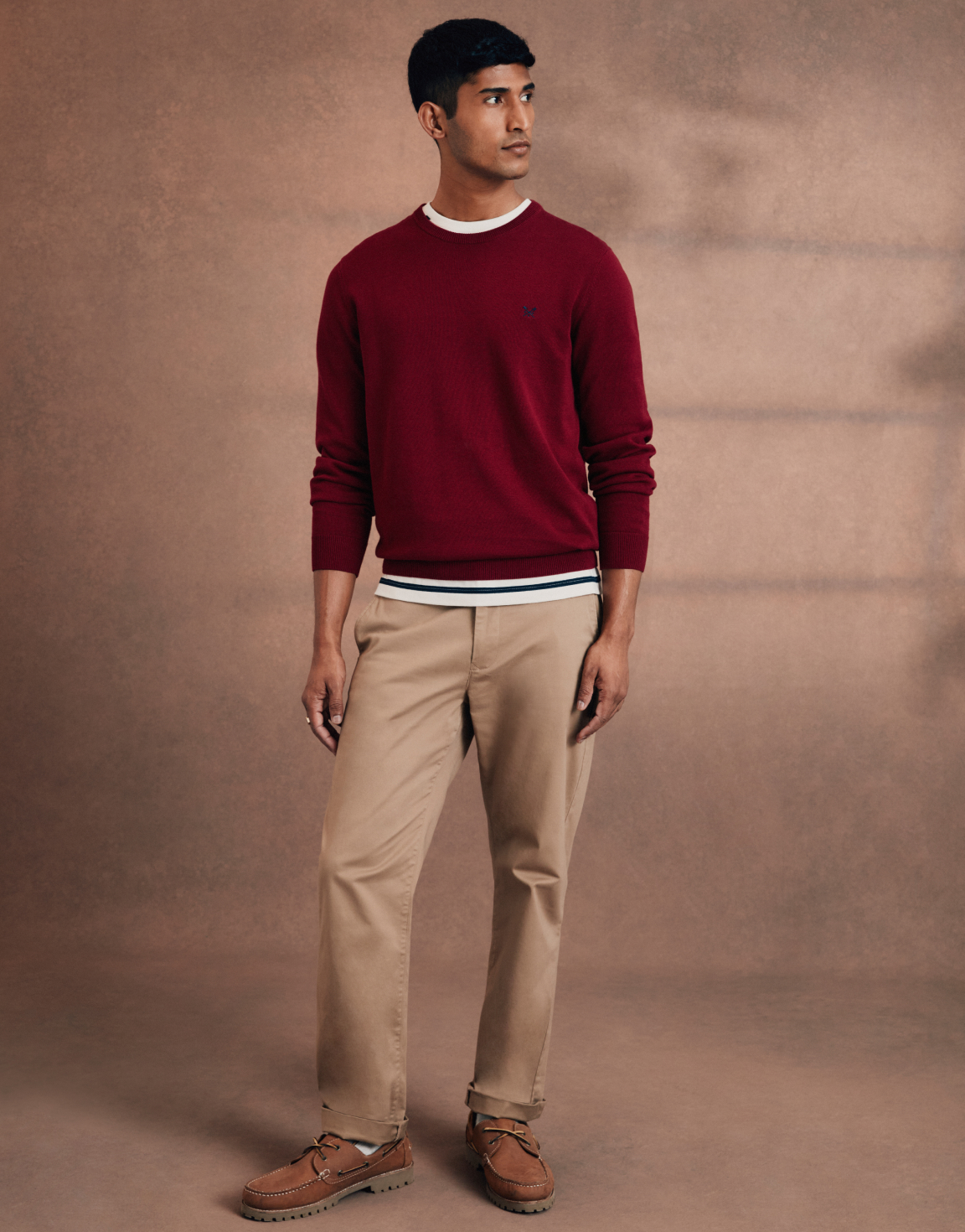 Every new season wardrobe deserves that one crew neck jumper that can work for every occasion. This one in mulberry is perfect for that. The autumnal shade brings fresh touch to any outfit and works well with classic chinos every time. Perfect for taking you from work to weekend with ease.