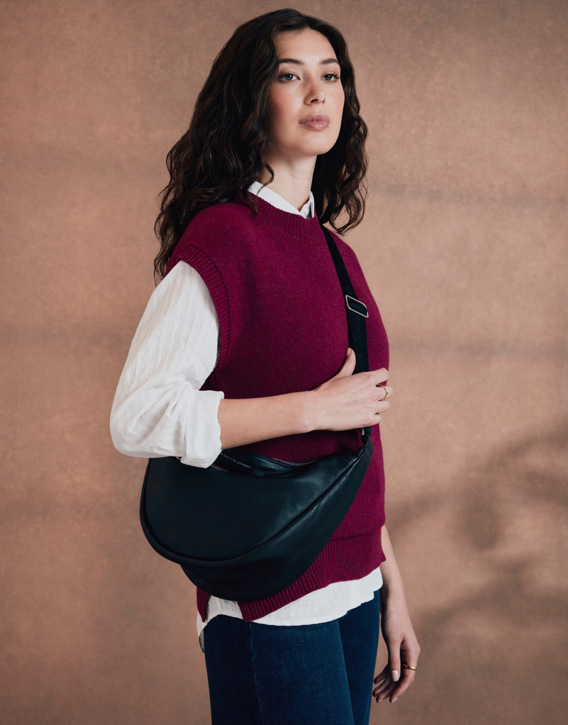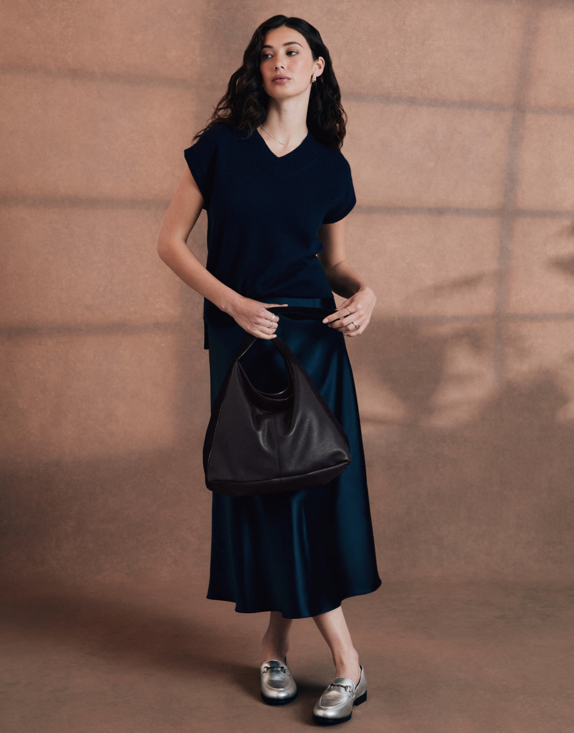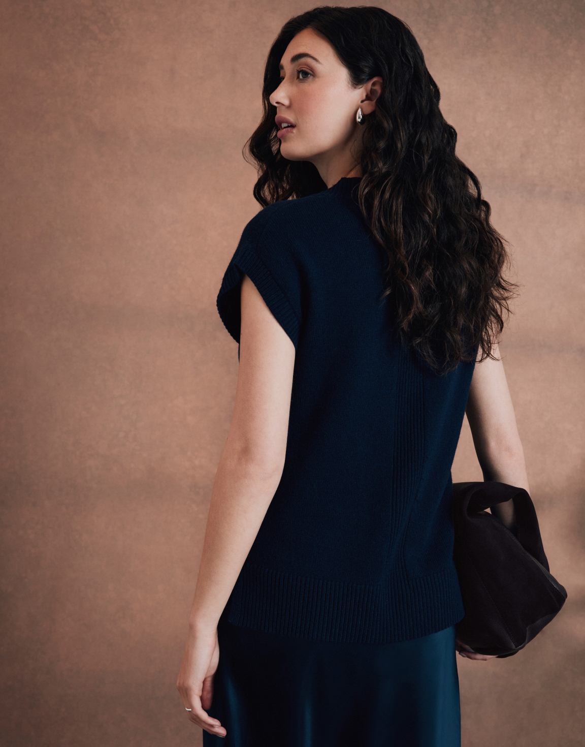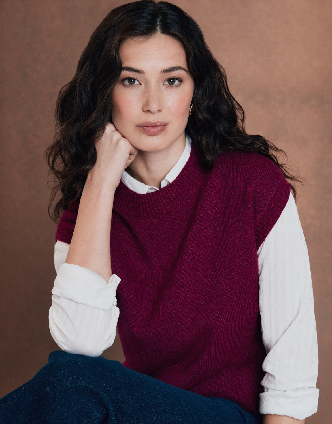 Sleeveless knitwear is this season's cosiest staple. As sweater weather begins, a sleeveless knit offers incredible versatility. A shorter version is perfect over a roomy shirt, while a longer vest has more of a relaxed vibe and looks great when worn solo, too. We love wearing ours with slip skirts and chunky loafers for a casual yet polished look. The styling possibilities are endless.