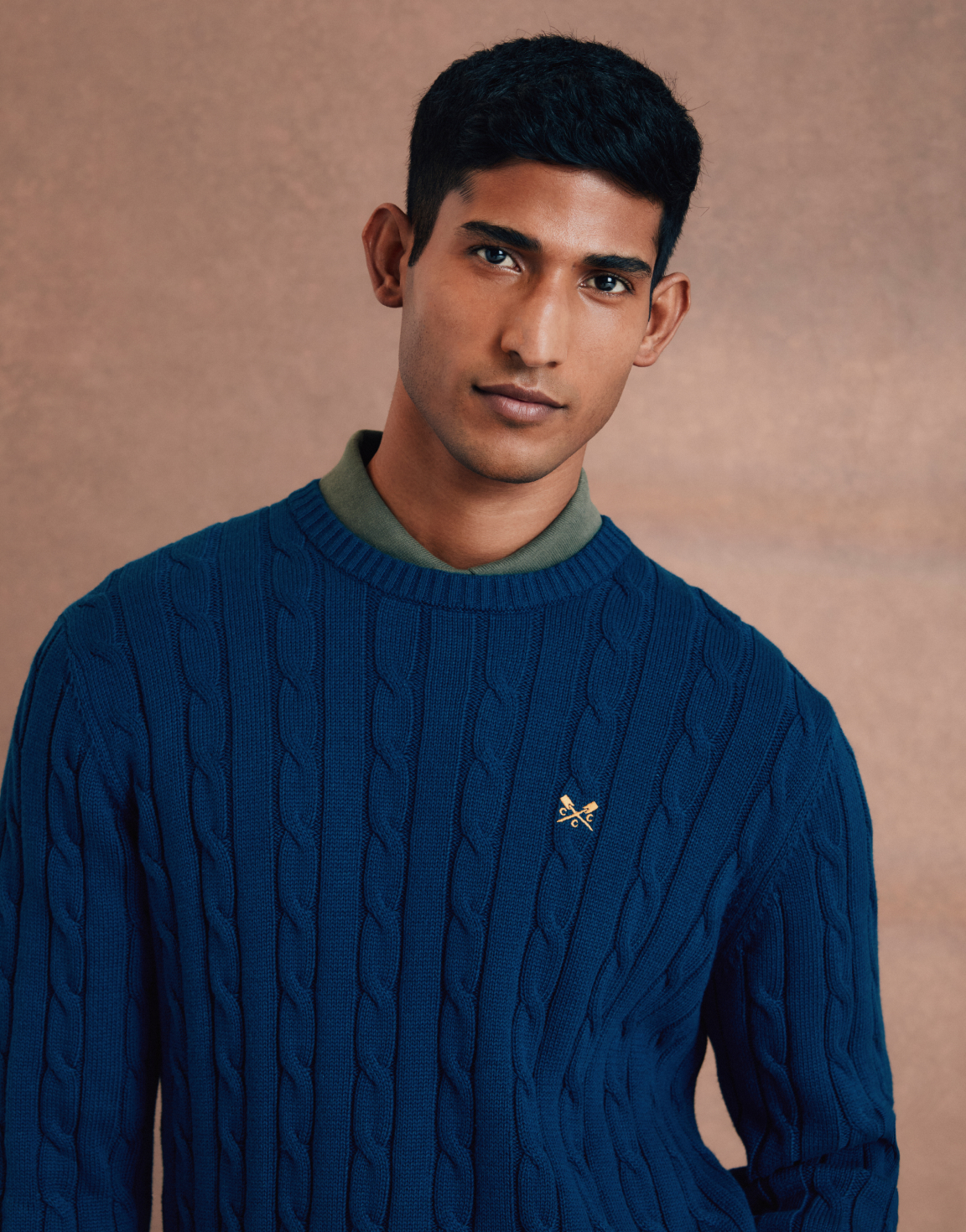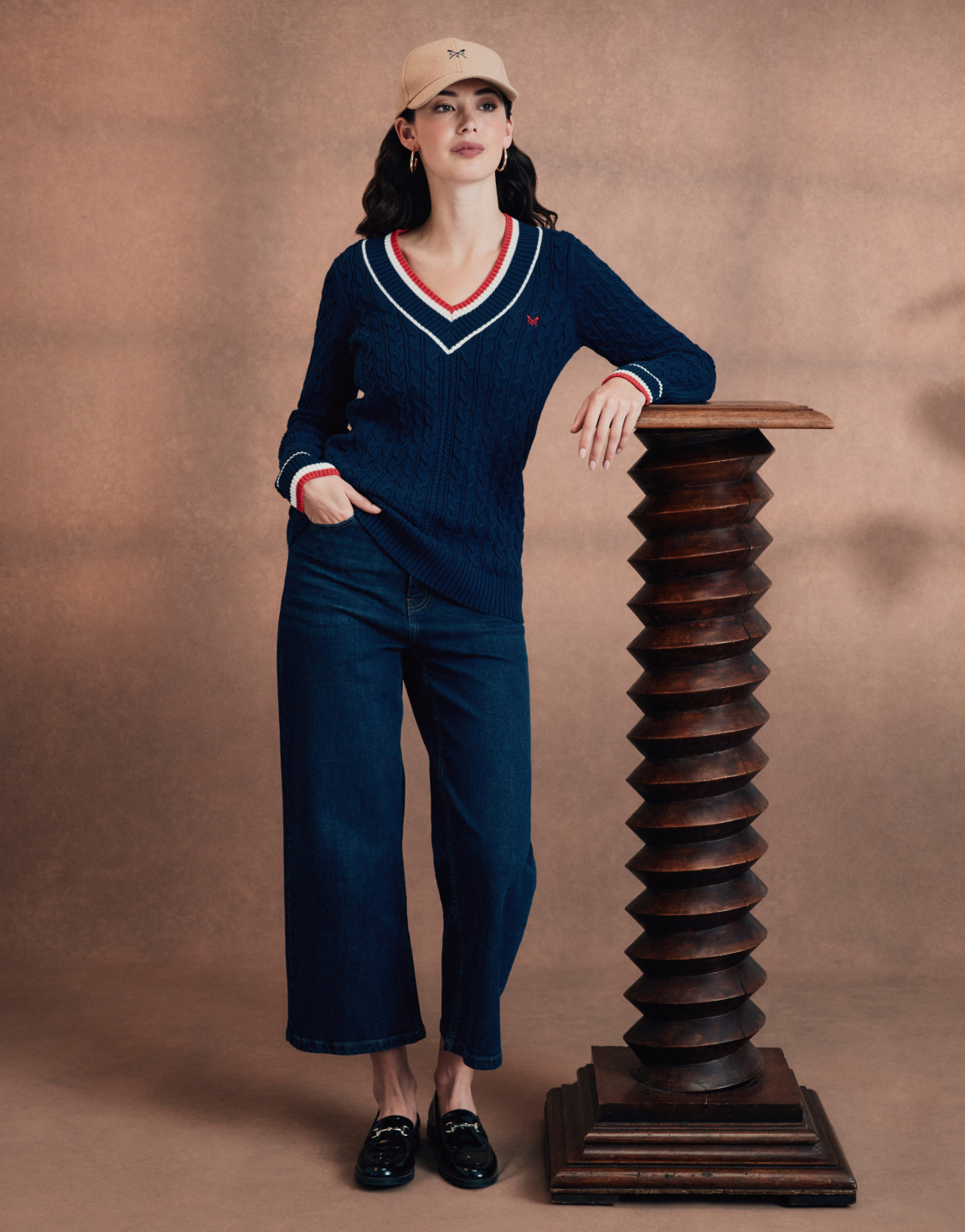 The pleasure of finding the perfect trophy knit is always a good feeling. One that is cosy and would look good with your favourite pair of jeans. Our cricket jumper in navy is just that. We've designed it in a classic cable knit with red tipping, cosy ribbed hems and added our crossed oars, neatly embroidered on the hem. Wear with a baseball cap and loafers for extra varsity points.