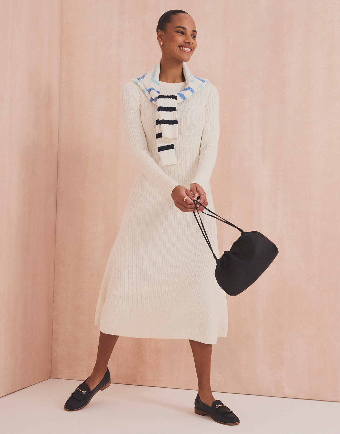 The dress. A transitioning go-to thanks to its versatility and effortless styling options. On warmer spring days, replace the tights and boots for a sleek white trainer – oh-so-cool, and on midi-length styles, leave a couple of bottom buttons undone for extra-swish appeal. Finish off with a knit tied around the shoulders or opt for a fully knitted style and accessorize how you wish. Effortless.