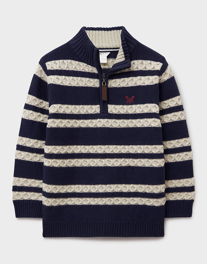 An organic-cotton half-zip jumper in dark navy blue. It is made in the softest knit for all-important comfort. With crossed oars logo embroidery and a funnel collar, this easy-to-wear layer is a classic look. Inspired by our maritime heritage, we’ve added a charming ‘rope’ cable design in an intricate intarsia style. From surf to dry land, this one’s a winner.