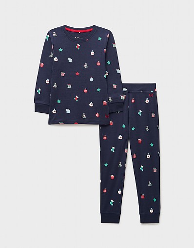 Long Sleeve Printed Christmas Pyjama Set in Navy