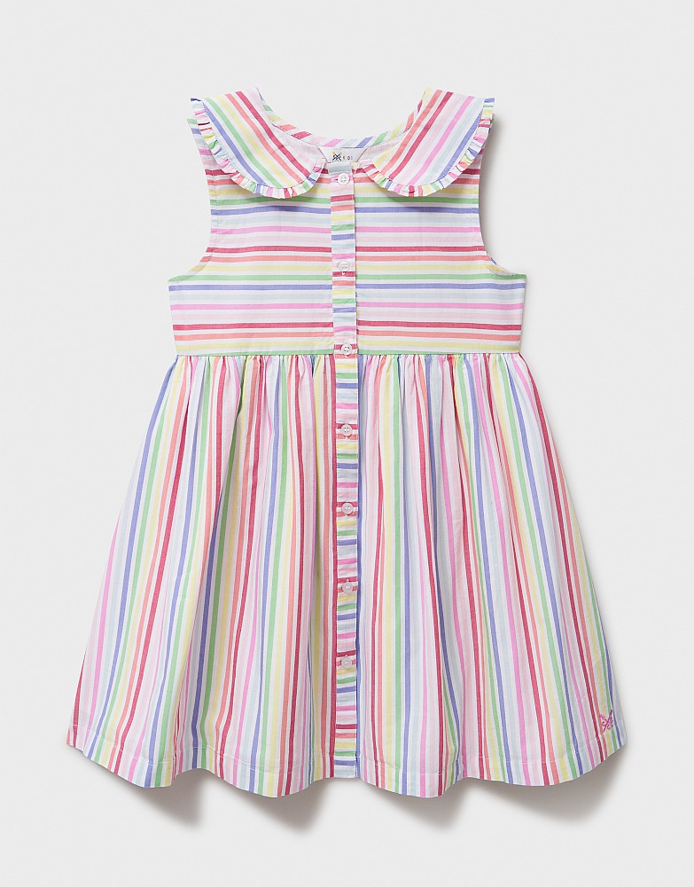 Presenting our sleeveless cotton dress in multicoloured stripes. Comfortable for little ones, it’s made in a light, breathable weave that’s perfect for sunny days out. The Peter Pan collar trimmed with frills, branded front buttons, and gently flared skirt make the dress a charming combination of classic and modern. Team with her favourite sandals for an easy outfit she’ll love.