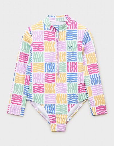 Zip-Front Long-Sleeve Swimsuit in Rainbow Print