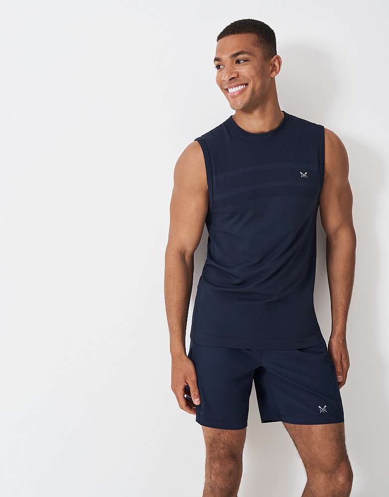 Our core sport vest in dark navy blue. This activewear top boasts a seam free construction to allow optimal movement, along with moisture-wicking properties for maximum comfort and breathability, aiding in performance and recovery. Both the perforated jacquard panels and high-visibility reflective lozenge detail on the back help cool you down during intense workouts. Style and function, combined.