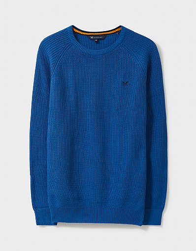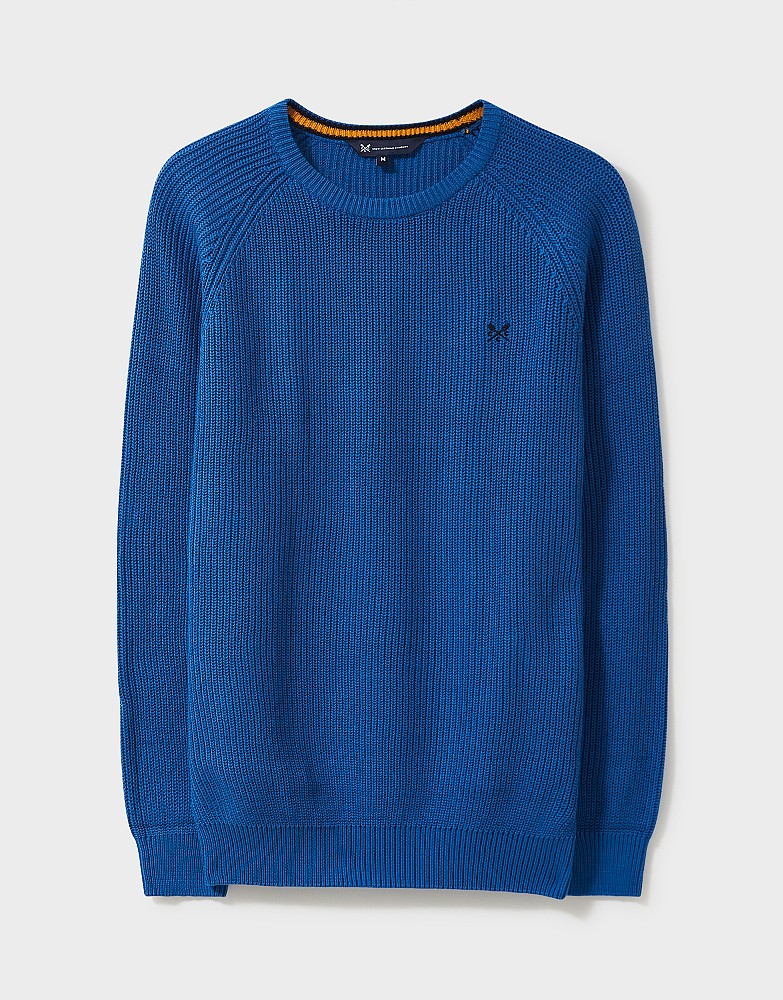 A fisherman knit jumper in blue. Perfect for layering on chillier days, this crew neck style has been finished with golden contrast touches. It’s all in the detail.