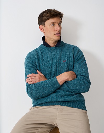Lambs Wool Cable Knit Crew Neck Jumper in Blue Marl