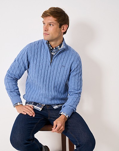 Oarsman Cable Organic Cotton Half Zip Jumper in Light Blue Marl