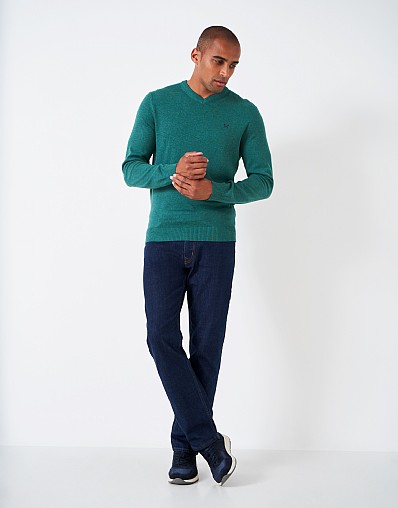 Our organic cotton v neck in green. This soft style neatly slips over t-shirts and shirts. We’ve added a little stripe detailing inside the back of the neck and our signature embroidery on the chest.