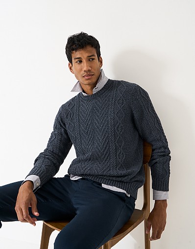 Recycled Cotton Cable Crew Neck Jumper in Navy