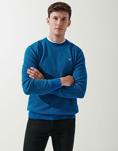 A waffle crew neck jumper in blue and grey. This knit is all about the texture with a failsafe design completed with a ribbed collar, cuffs and hem and our crossed oars embroidered on the chest. Wear from week to weekends, pairing with inky dark denim and classic trainers.