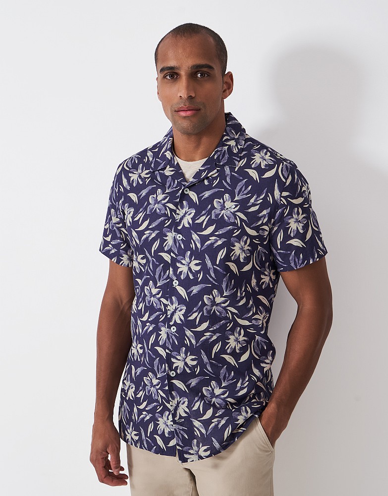 A short sleeve linen shirt in a navy and white all-over floral print. The perfect partner to chinos or shorts, this is a clear winner for warmer days. It’s smart but will keep you cool.