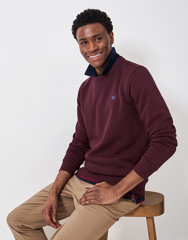 This is our burgundy-red sweatshirt. An essential for styling a whole host of outfits, this perfectly simple layer is anything but basic. It's made from soft cotton-blend jersey for comfort and detailed with our embroidered crossed oars in pale blue. Pair with chinos to elevate the look, or team with joggers on days off.