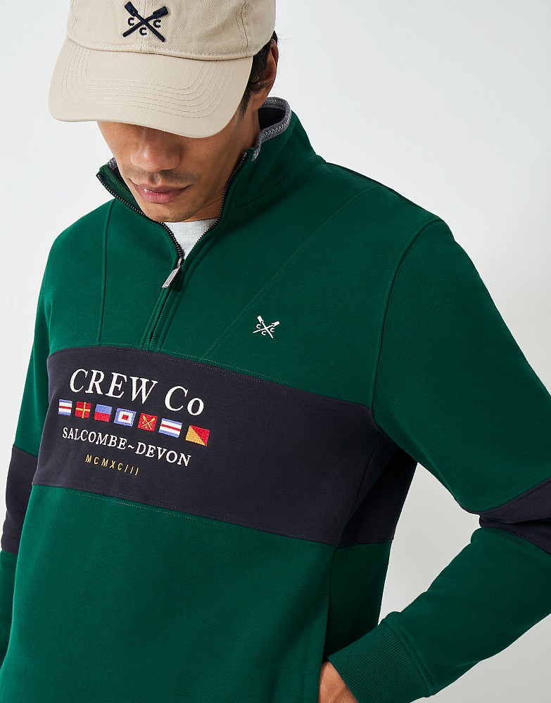 Cut and Sew Embroidered Half Zip Sweatshirt in Dark Green
