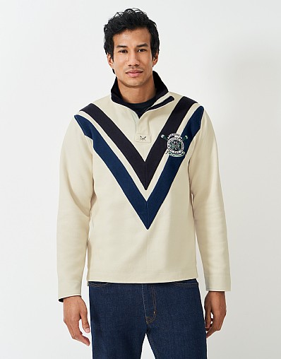 The signature rugby Padstow sweatshirt in ecru. We've designed this heritage piece with embroidery beneath the back collar, blue chevron detailing, and crest artwork on the chest, adding a distinctively sporty feel. Layer over a tee for a laid-back look, or wear with a polo for a smarter style.