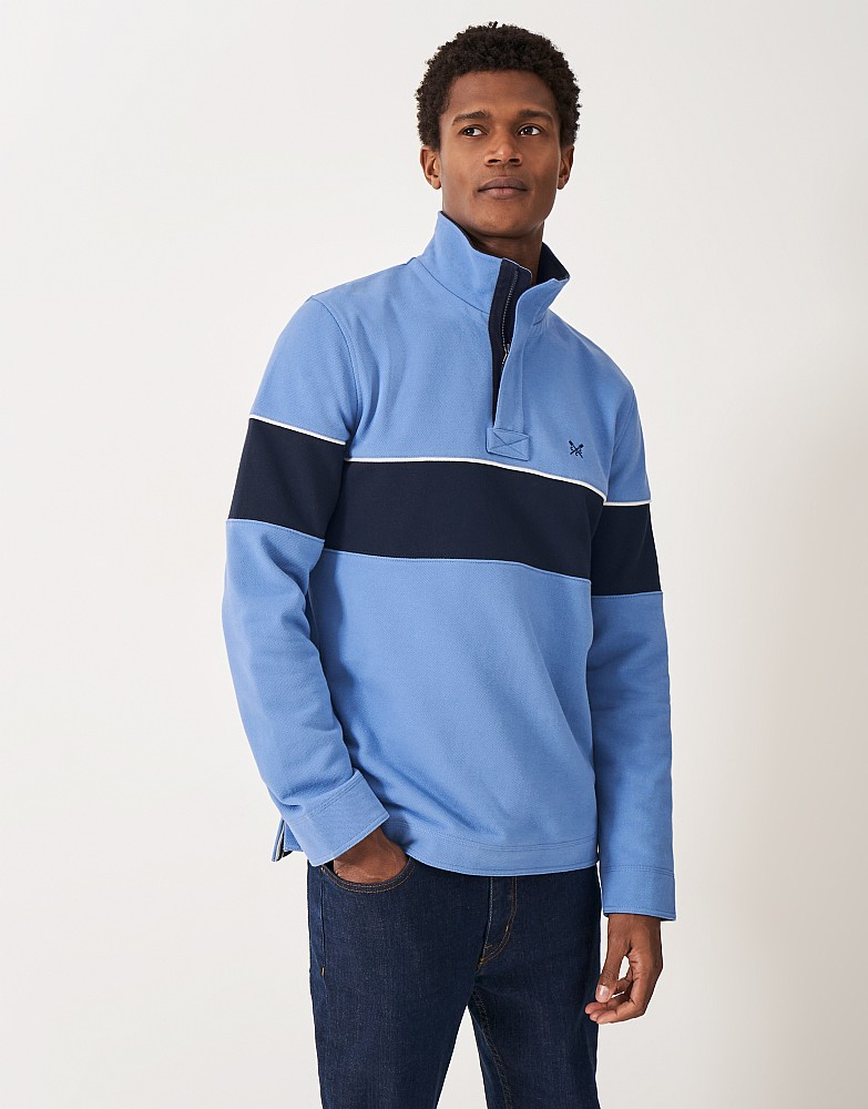 Our cut and sew Padstow pique sweatshirt in blue, navy and white. Featuring a contrasting stripe on the chest, underarm eyelets, a zip pull and our crossed oars neatly embroidered on the chest. Pair with jeans and step out in style.