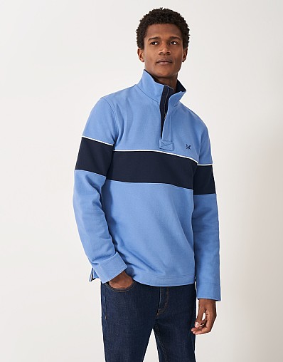 Our cut and sew Padstow pique sweatshirt in blue, navy and white. Featuring a contrasting stripe on the chest, underarm eyelets, a zip pull and our crossed oars neatly embroidered on the chest. Pair with jeans and step out in style.