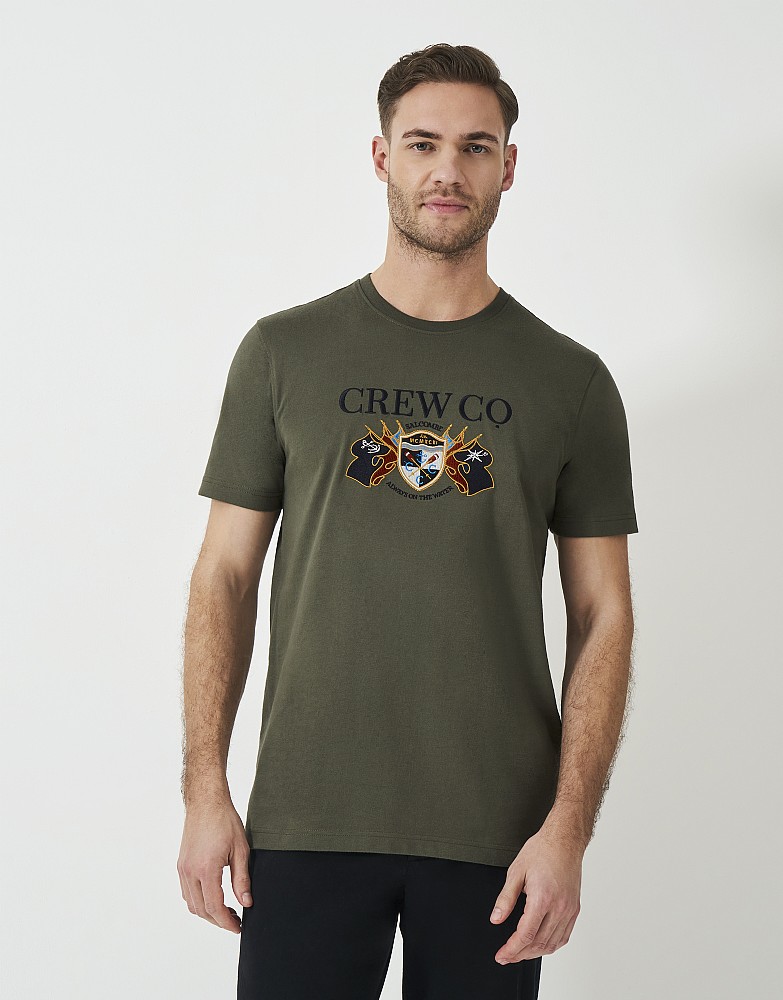 Crew Neck Embroidered Flag T-Shirt in Olive
