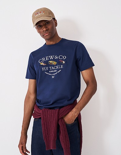 Embroidered Cotton Fly Fishing Tee in Deep Blue