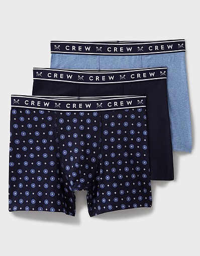 A three pack of boxers in navy, sky blue and navy with a foulard print design. These are designed from a soft cotton modal blend, with added stretch for comfort and they feature classic Crew branding on the waistband. Add to basket and you’ll have your essentials sorted.