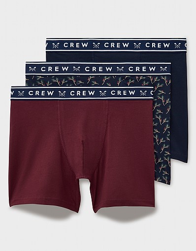 A three pack of plain and holly printed boxers in navy and burgundy. These are perfect upgrades to your underwear drawer, or a great gift for someone special. We love the Crew branded waistband - the perfect finishing touch.