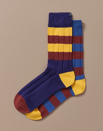 A two pack of thick socks in striped dark red, blue and yellow, inspired by rugby. Just what you need on cooler days, these socks add welcome warmth to whatever shoes you pair them with.