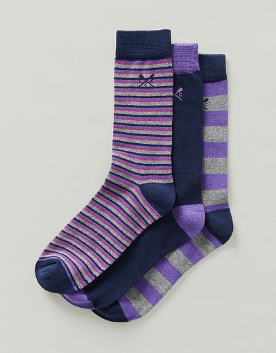 A pack of three socks in purple, navy and grey. With two striped pairs and one plain, this is the ideal set. They come in a box making this perfect for gifting.