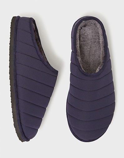 Super soft and cosy mule slippers in navy. In a sporty navy nylon with a fluffy grey lining, these are the very definition of winter footwear. Slip them on first thing and never want to take them off.