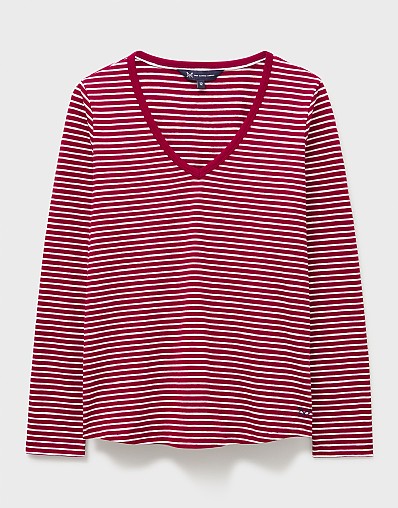 A red and white striped top. Designed with a flattering v-neckline and comfy long sleeves, it’s just the thing for teaming with jeans for a relaxed ensemble. Plus, our signature crossed oars embroidered on the hem is the perfect finishing touch. Add to your collection now.