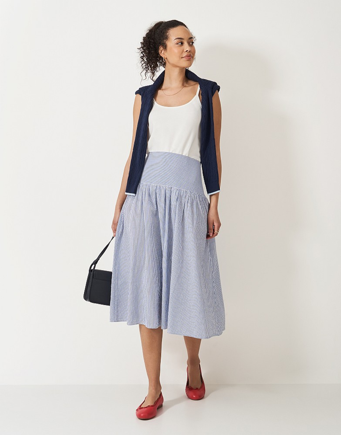 Bridgerton actress, Pheobe Dynevor, attended 2023’s Wimbledon wearing our favourite pattern – you guessed it, stripes. The pretty two-piece, detailed with blue and white pinstripes, waist belt and a matching strappy cami-style top, looked effortlessly chic. A fresh take on the nautical, we love her style by pairing with simple accessories. But why not add a pop of red for all-out coastal vibes - we’ve paired our red Ballerina Flats with our Dara Stripe Skirt – a worthy comparison to Pheobe’s if you want to get the look.