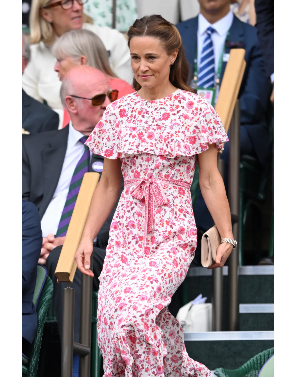 If anyone knows how to adorn a floral number, it’s Pippa Middleton. With her being a huge tennis fan since childhood, we’re used to seeing her arrive at Wimbledon over the years dressed in stunning ensembles. Her 2024 championship dress was no exception, with its ribbon-like tie belt, caped detailing and feminine painterly print, she went straight to the top of our list for style points. Thinking of recreating Pippa’s look this year? We’ve got just the piece – our Ella Tea Dress. It’s delicate silhouette and pretty ditsy pattern is perfect for summer events just like the tennis. We’ve paired it with a simple clutch like Pippa and flat sandals – so you can comfortably get up and down to top up the Pimm’s all-day long…