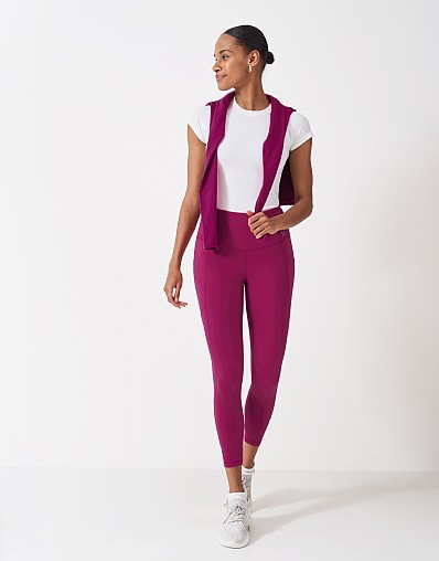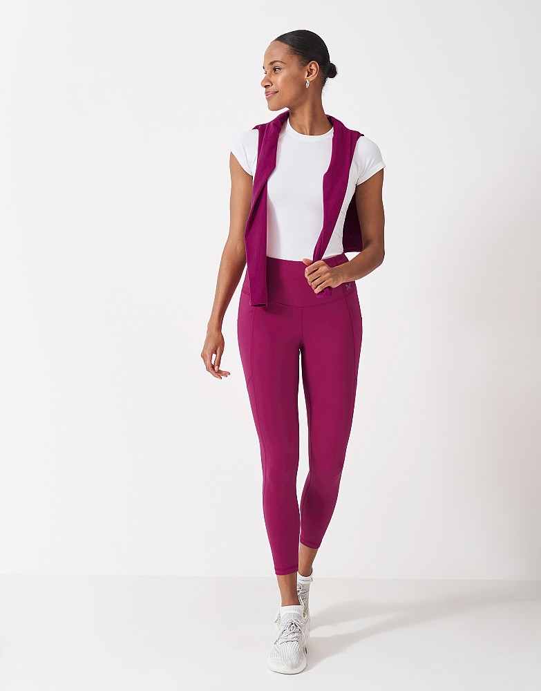Our 7/8 Activewear leggings in charry. Designed in a shorter length, sitting comfortably above the ankle. The high rise, flat laying waistband lends itself to have a comfortable, flattering fit. Our nylon blend fabric feels light, has breathability thanks to sweat wicking properties, and the four way stretch adapts to the movement of your body for ultimate comfort, performance and recovery. Look out for the hidden details such as the waistband pocket and hip pockets, perfect for sorting valuables. No workout is complete without these.