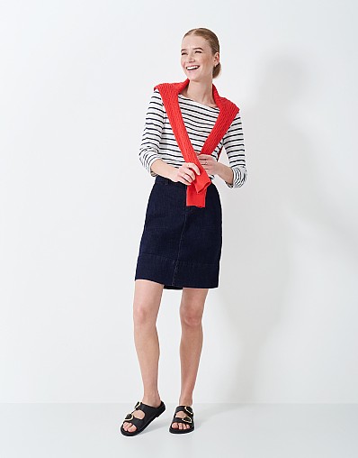 Our denim skirt in dark indigo has all the makings of becoming your casualwear go-to. With a branded front button and zip closure, four pockets, and belt loops, we’ve thought of everything you need on this midi skirt. Plus, we’ve detailed the back with crossed oars embroidery. The skirt is a wear-with-everything design fit for T-shirts, blouses and shirts. It’s an easy-to-style crowd-pleaser.