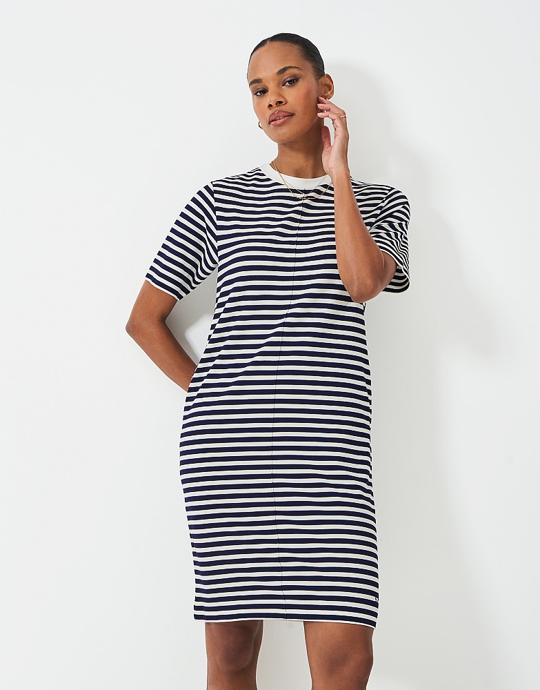The Ebony shift dress in navy and white stripes, made from supersoft viscose jersey for a beautiful drape. A minimalist look that can be dressed up or down, this above-the-knee-length dress has a round neckline, relaxed silhouette, and short sleeves. The dress is super-versatile.