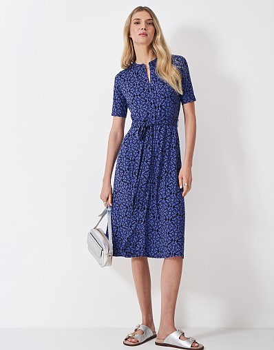 The Emila jersey shirt dress in blue and navy. The soft fabric is patterned with our ornate tile print for a truly elegant look. Plus, we love the elbow-length sleeves, removable tie belt, and hidden side pockets. Complement the colour palette with touches of metallic silver.