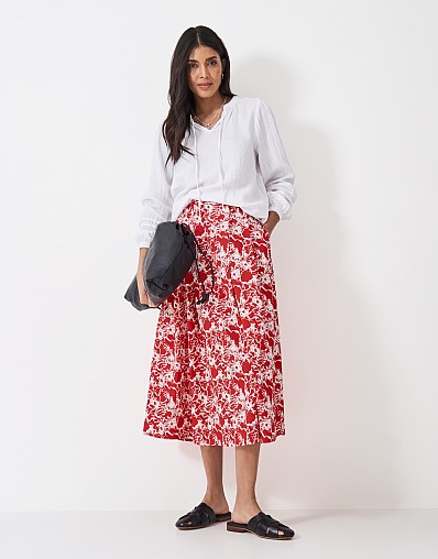 Introducing our Gabby cotton skirt in red abstract pop floral print. Designed in a flattering midi length, with darts for added shape and side pockets for functionality. The fullness of skirt creates plenty of movement, and looks great teamed with a pretty blouse tucked in. Alternatively, pair with a tee and jacket for a more paired-back look. Effortless.