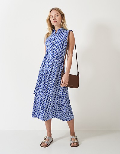 The Emma shirt dress is a style that needs no introduction. Made from soft viscose jersey and patterned with our vibrant blue geometric print, this sleeveless dress is the perfect choice for warm, sunny days. We’ve added branded buttons on the front, a classic point collar, and a detachable tie-up belt to cinch in the waist. The Emma can be worn with heels or flats – you’ll love its versatility.