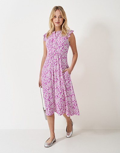 Lydia Frill-Sleeve Jersey Dress in Purple Floral Print