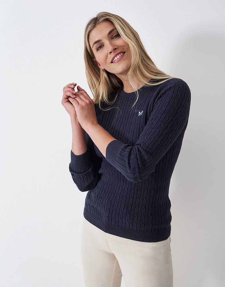 Crew Neck Cotton Cashmere Cable Knit Jumper in Navy