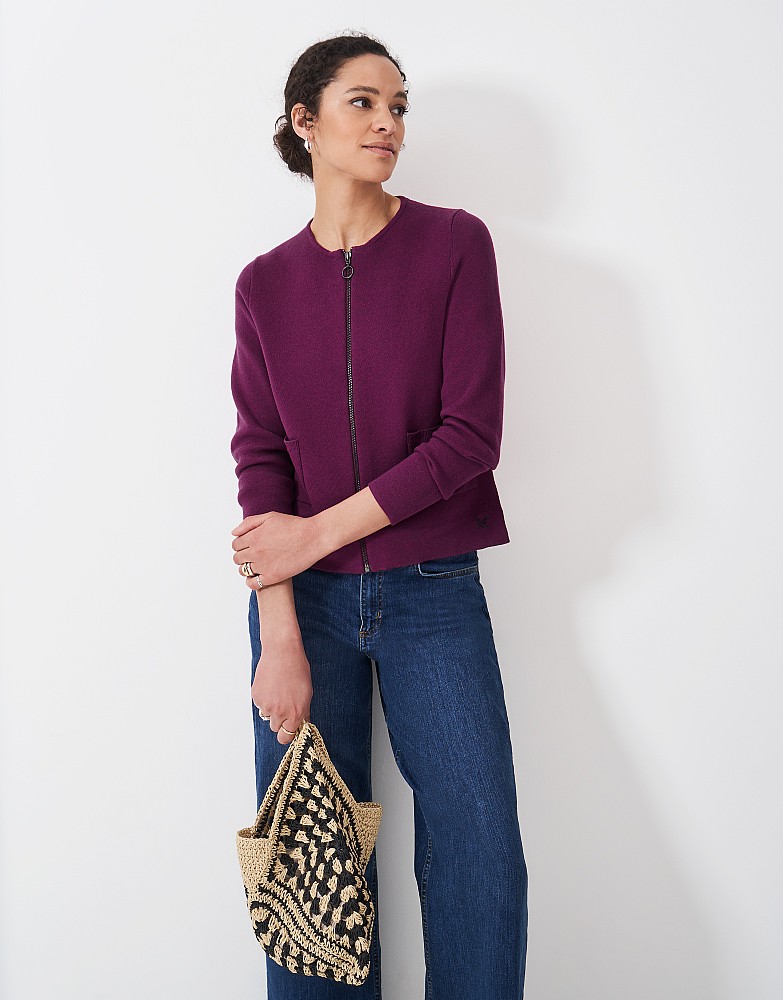 A modern take on a classic, this is the Carrie deep-purple bomber-style cardigan. The boxy, relaxed fit and patch pockets give the cardi a contemporary feel we love. Don't miss the crossed oars on the hem, too. Comfort and style go hand-in-hand with this zip-up top.